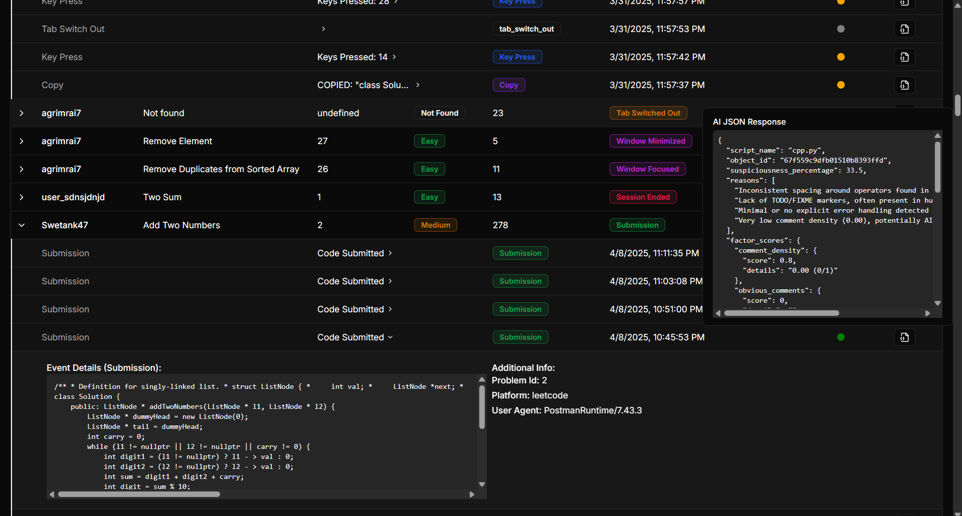 Syntax Sentry is an advanced AI-powered tool designed to detect and analyze potential cheating in coding assessments. By tracking user activity, code modifications, and behavioral patterns, we ensure fair competition and maintain academic integrity.